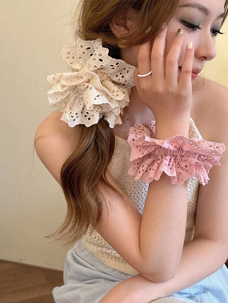 Bow Decor Floral Scrunchies Set, 2pcs Cute Hair Ties Ponytail Holders For Women